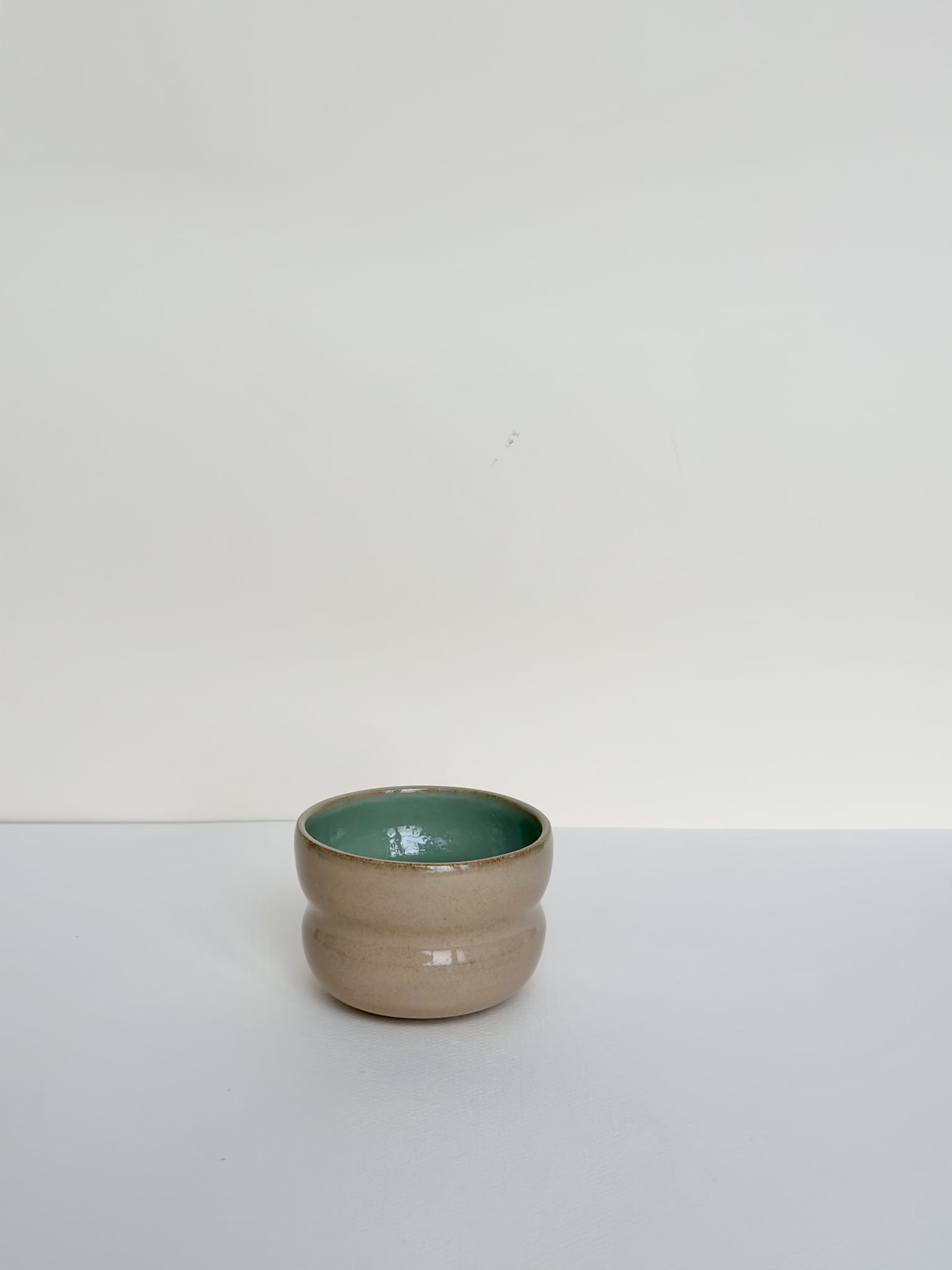 Czarka wytoczona ręcznie na kole z kamionkowej gliny w kolorze toffi. W całości szkliwiona błyszczącymi szkliwami: piaskowym i szałwiowym.