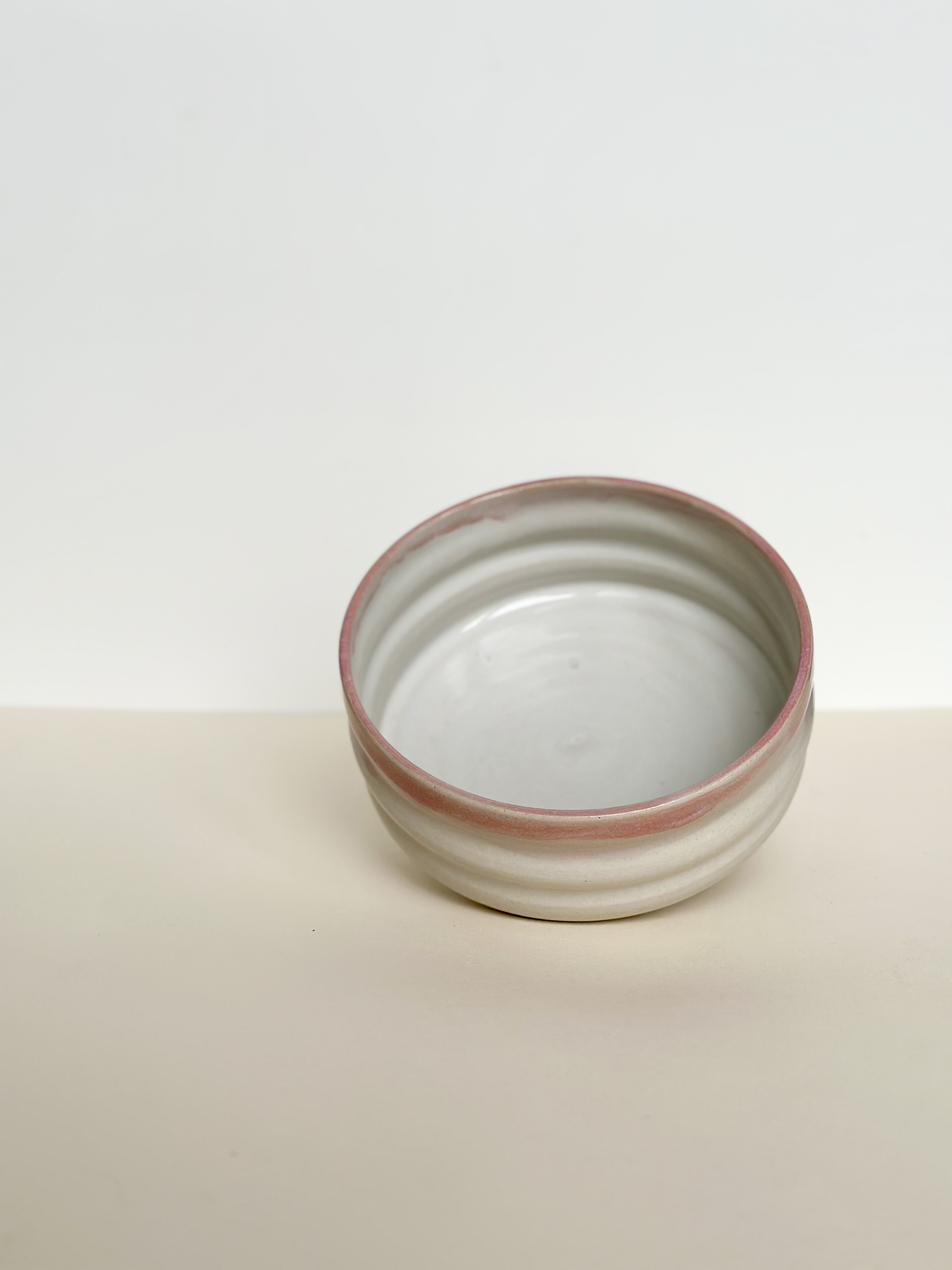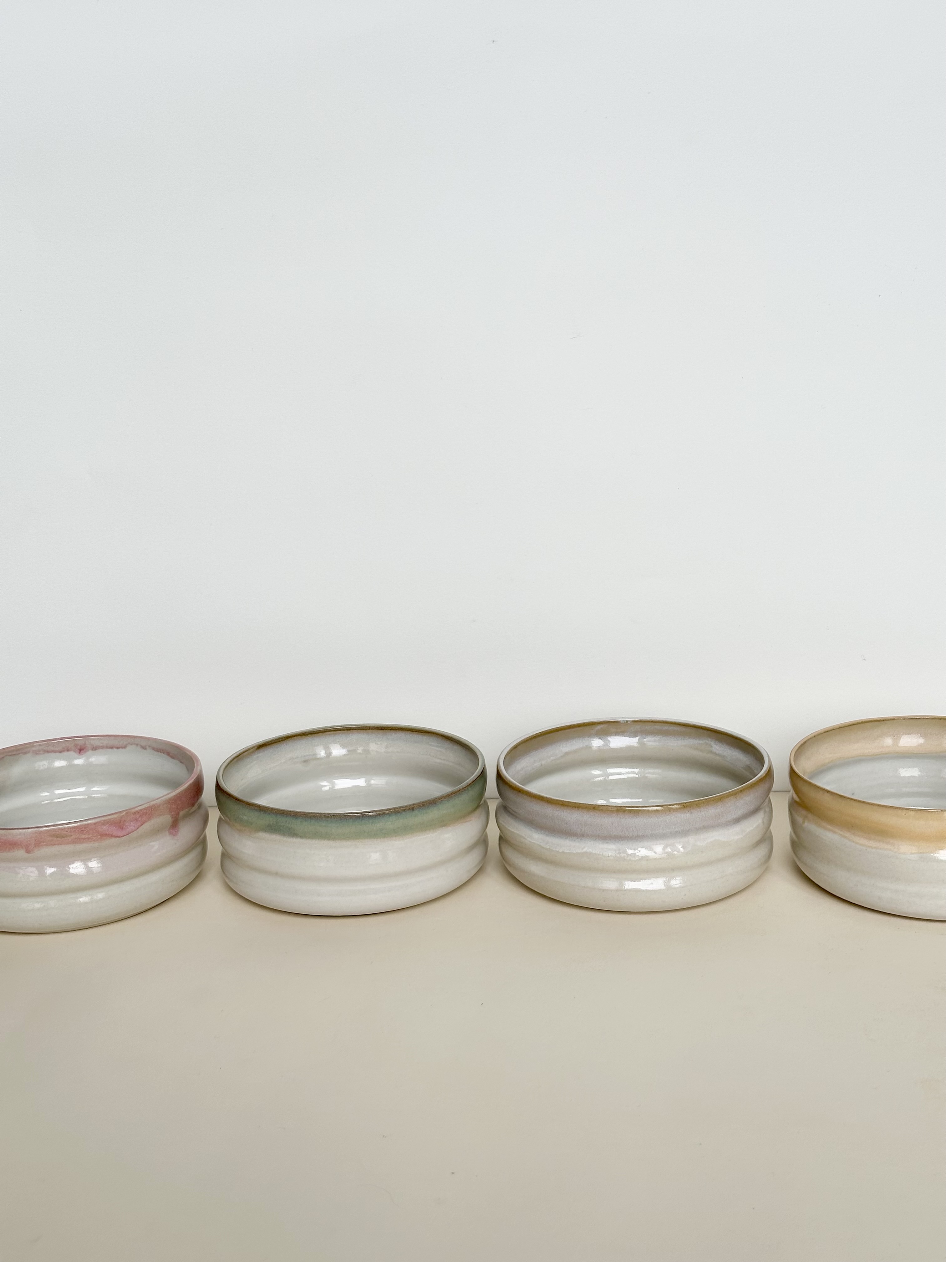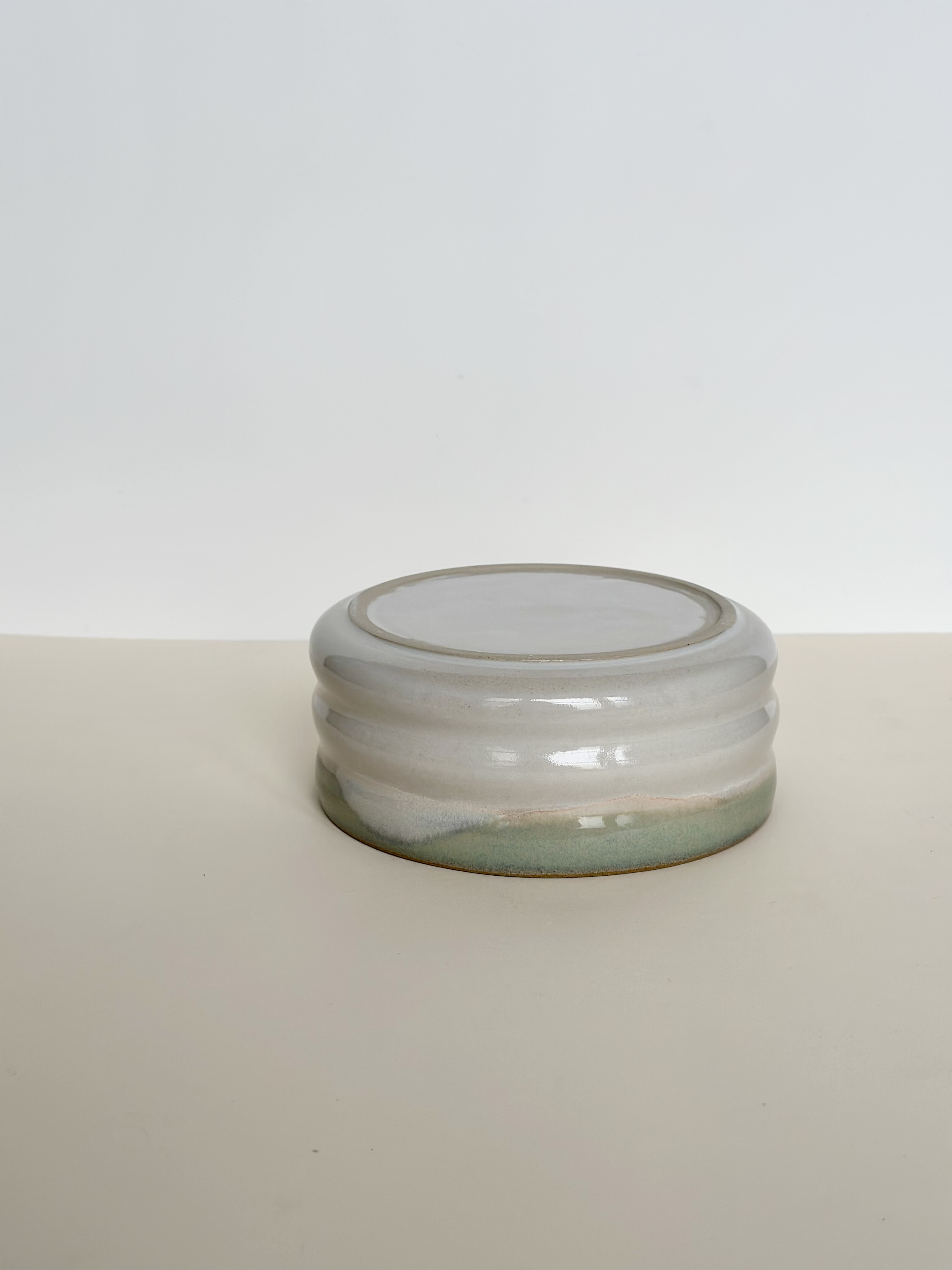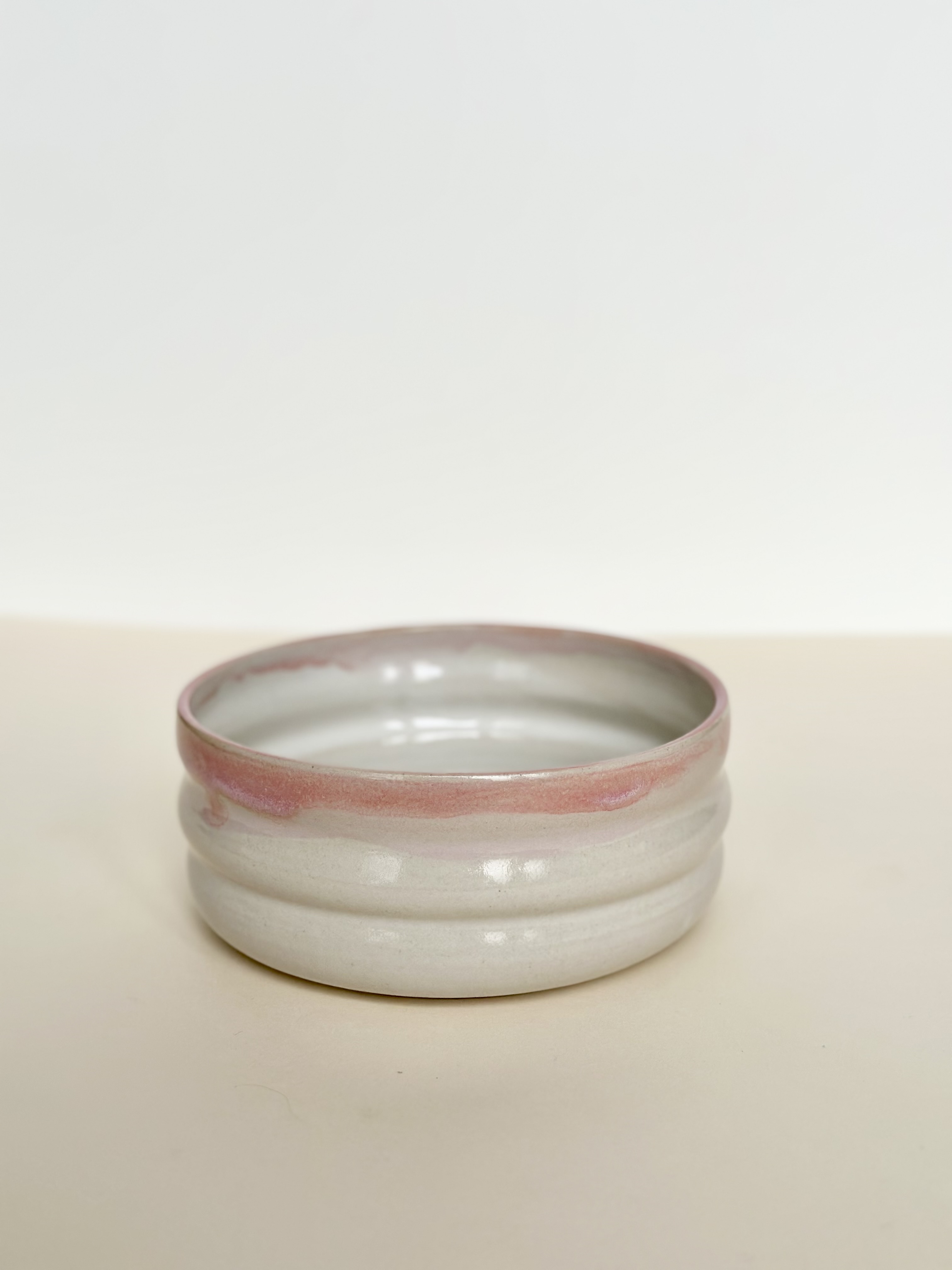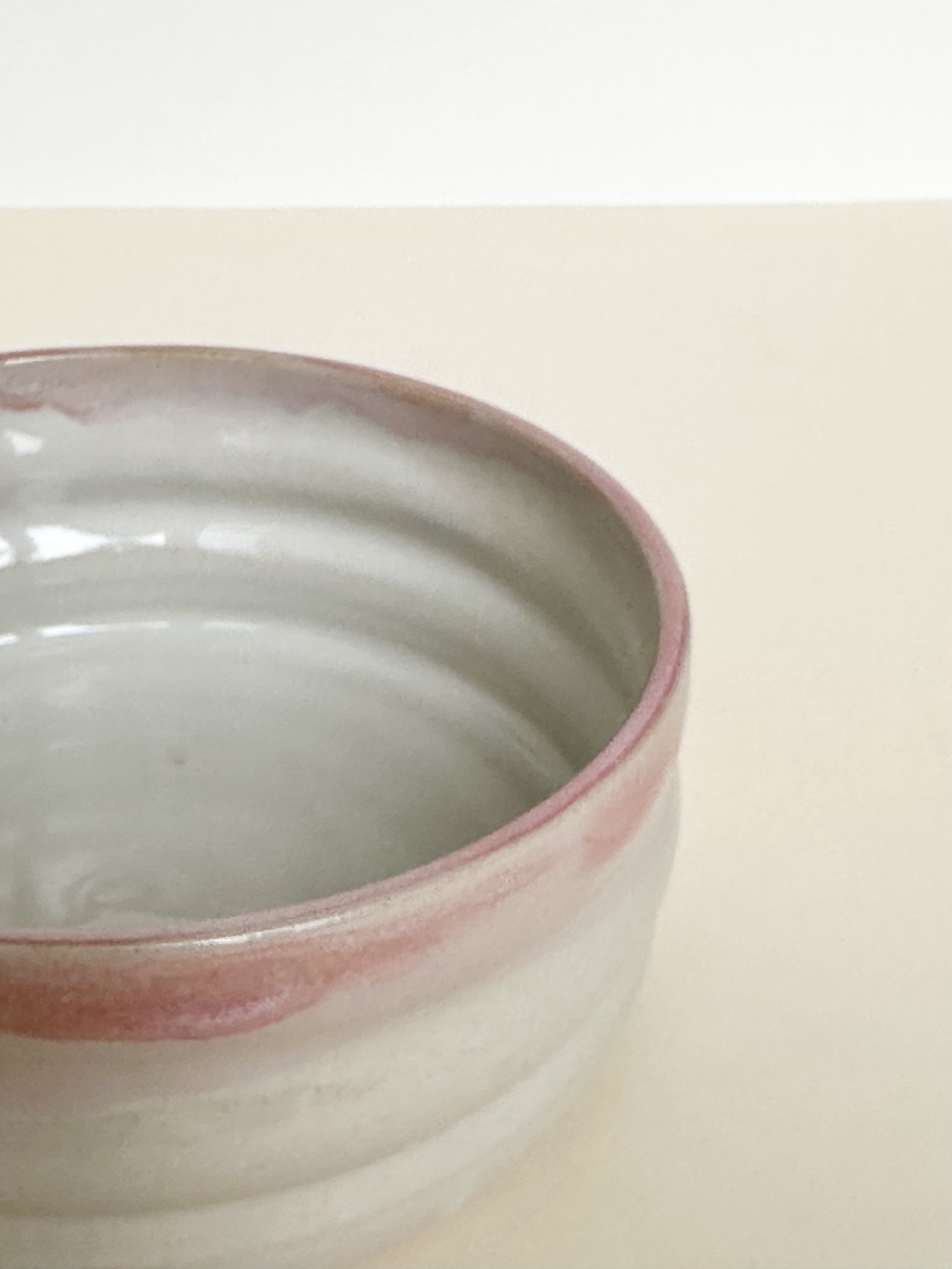 Pokryta ciepłym białym szkliwem z pastelowo barwionym rantem. Kolor delikatnie spływa ku kremowej powierzchni wnętrza, tworząc subtelne przejścia tonalne.