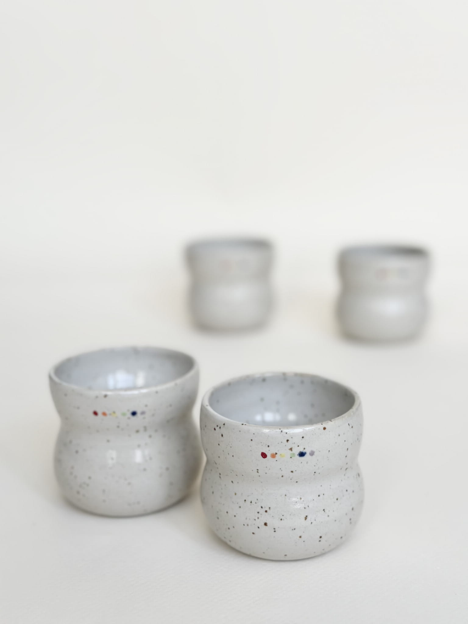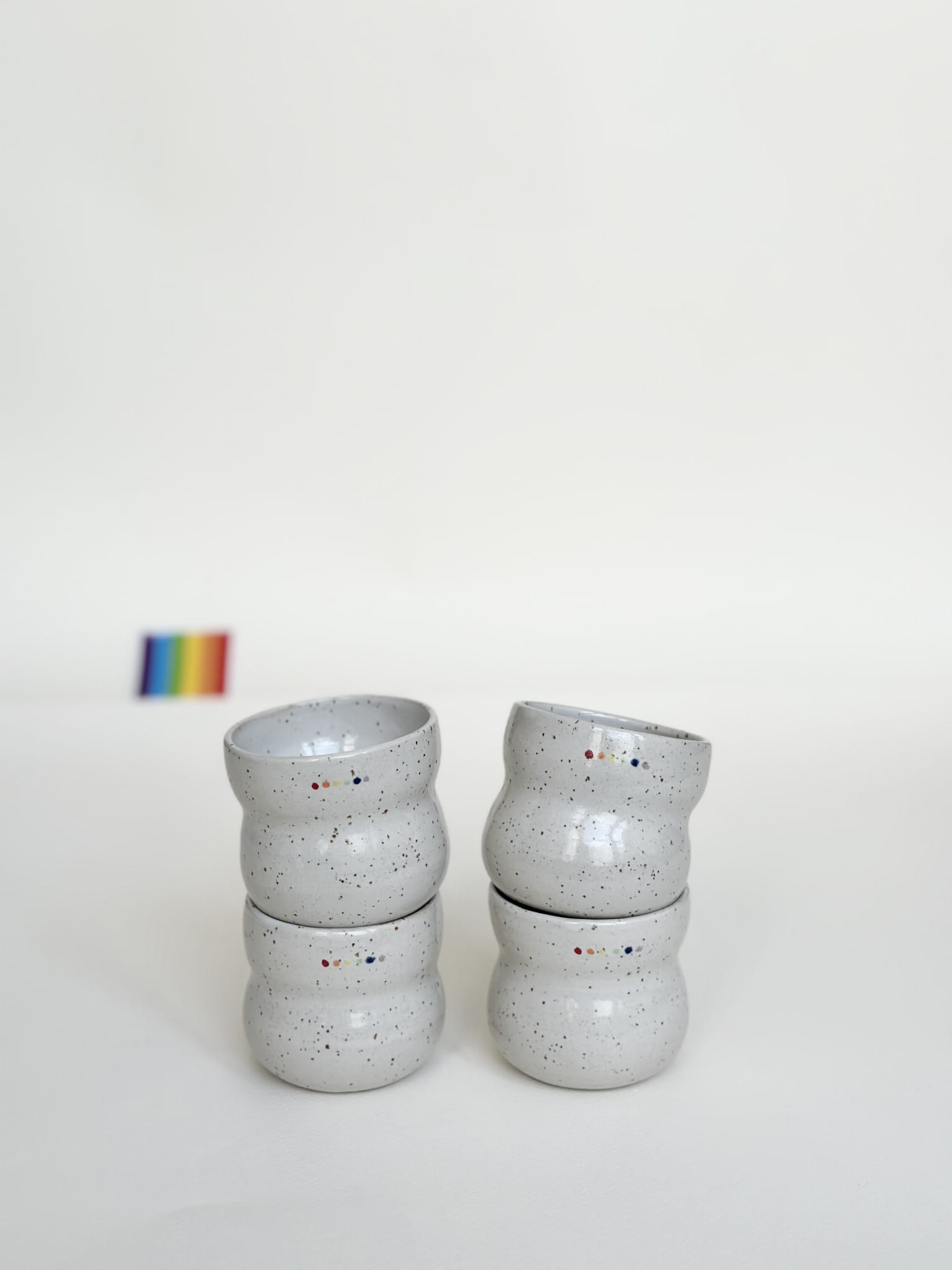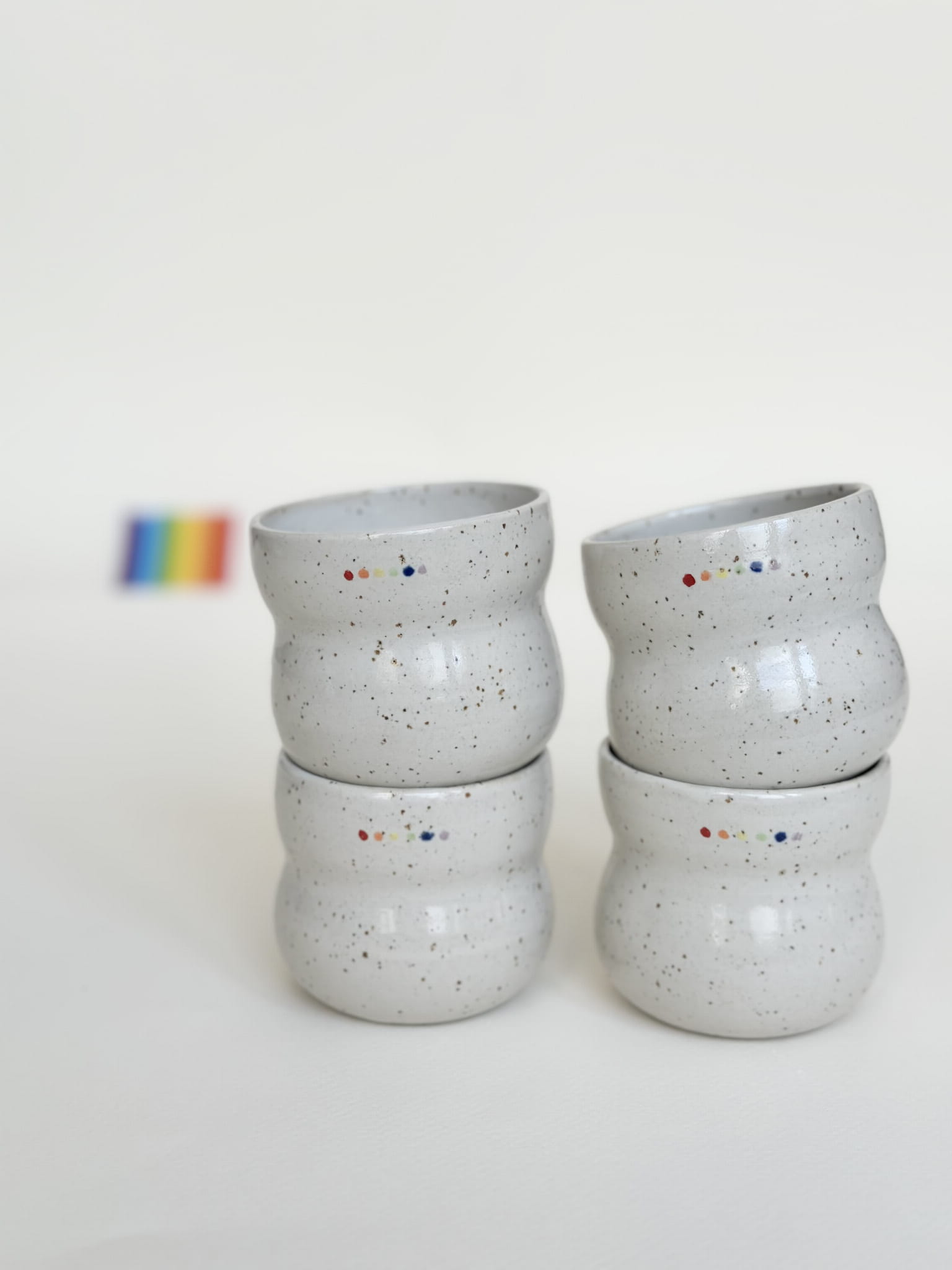 Brzuchata biała czarka z tęczowymi kropeczkami. Minimalizm, ale i radość!