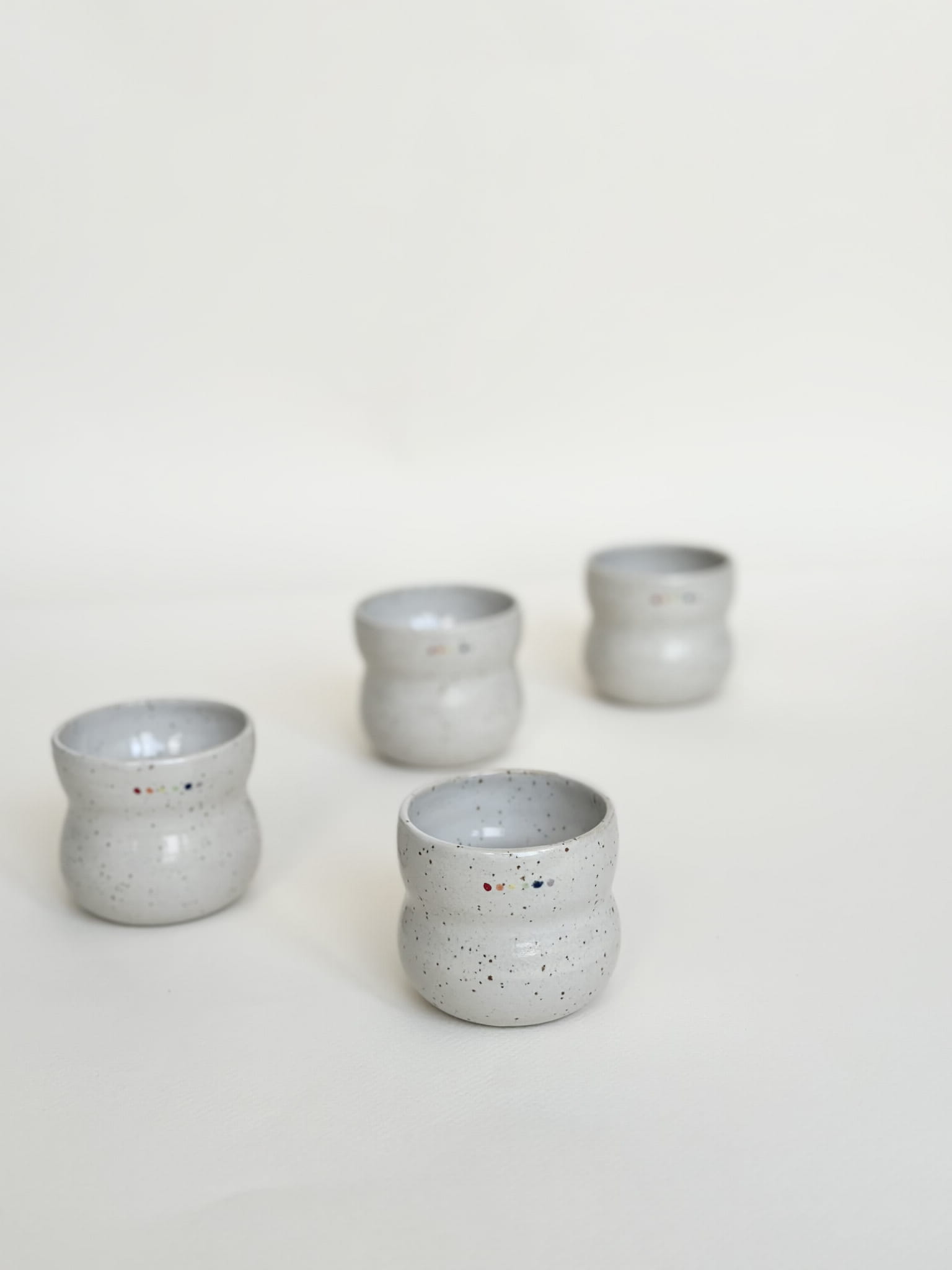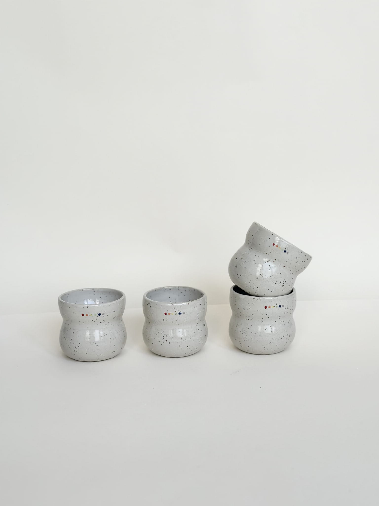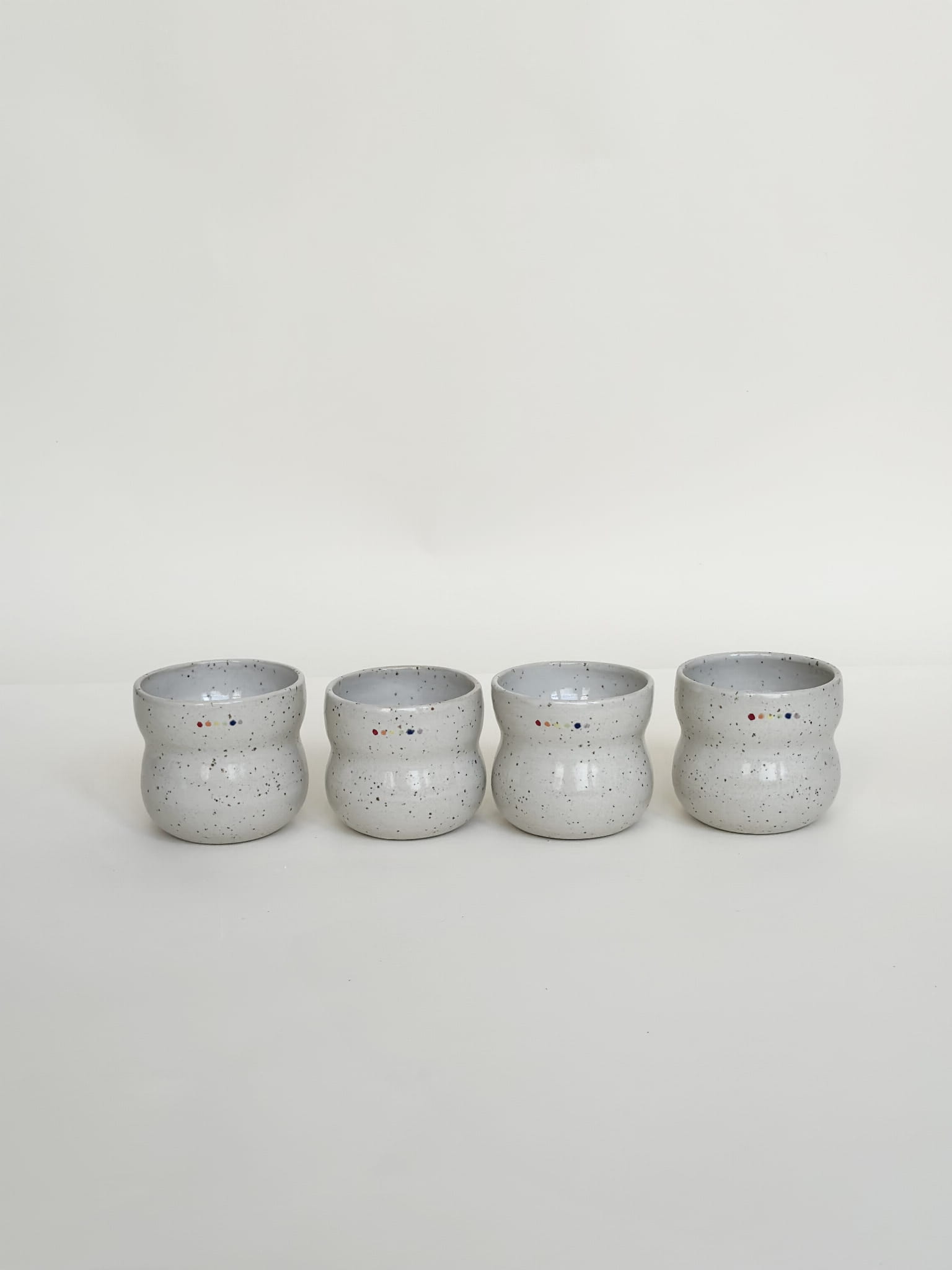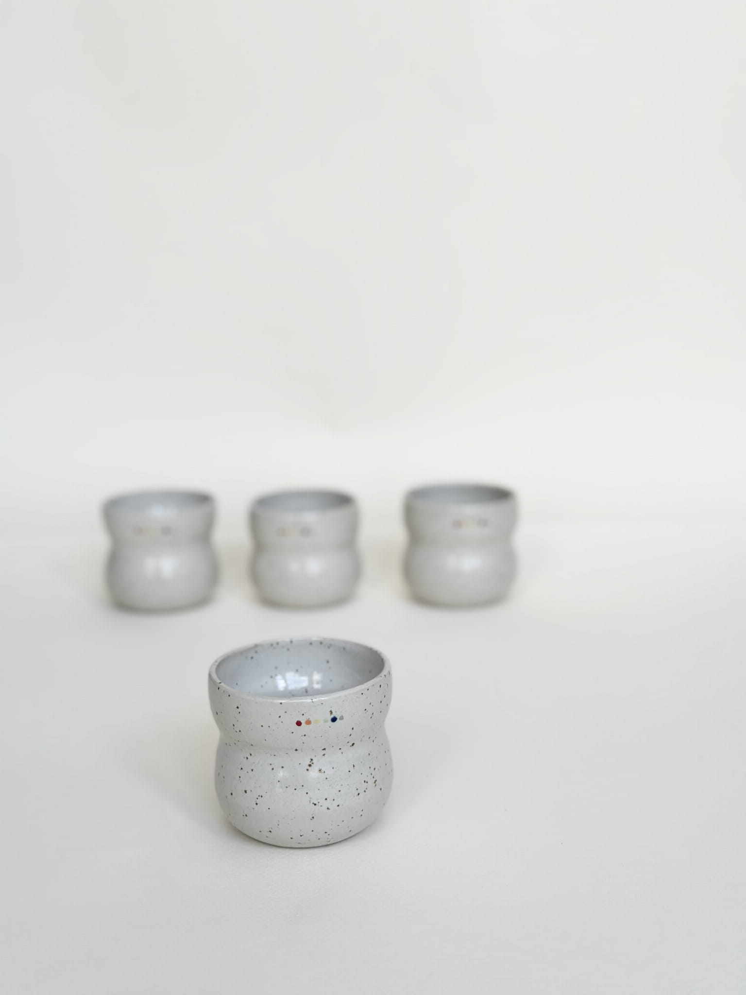 Brzuchata biała czarka z tęczowymi kropeczkami. Minimalizm, ale i radość!