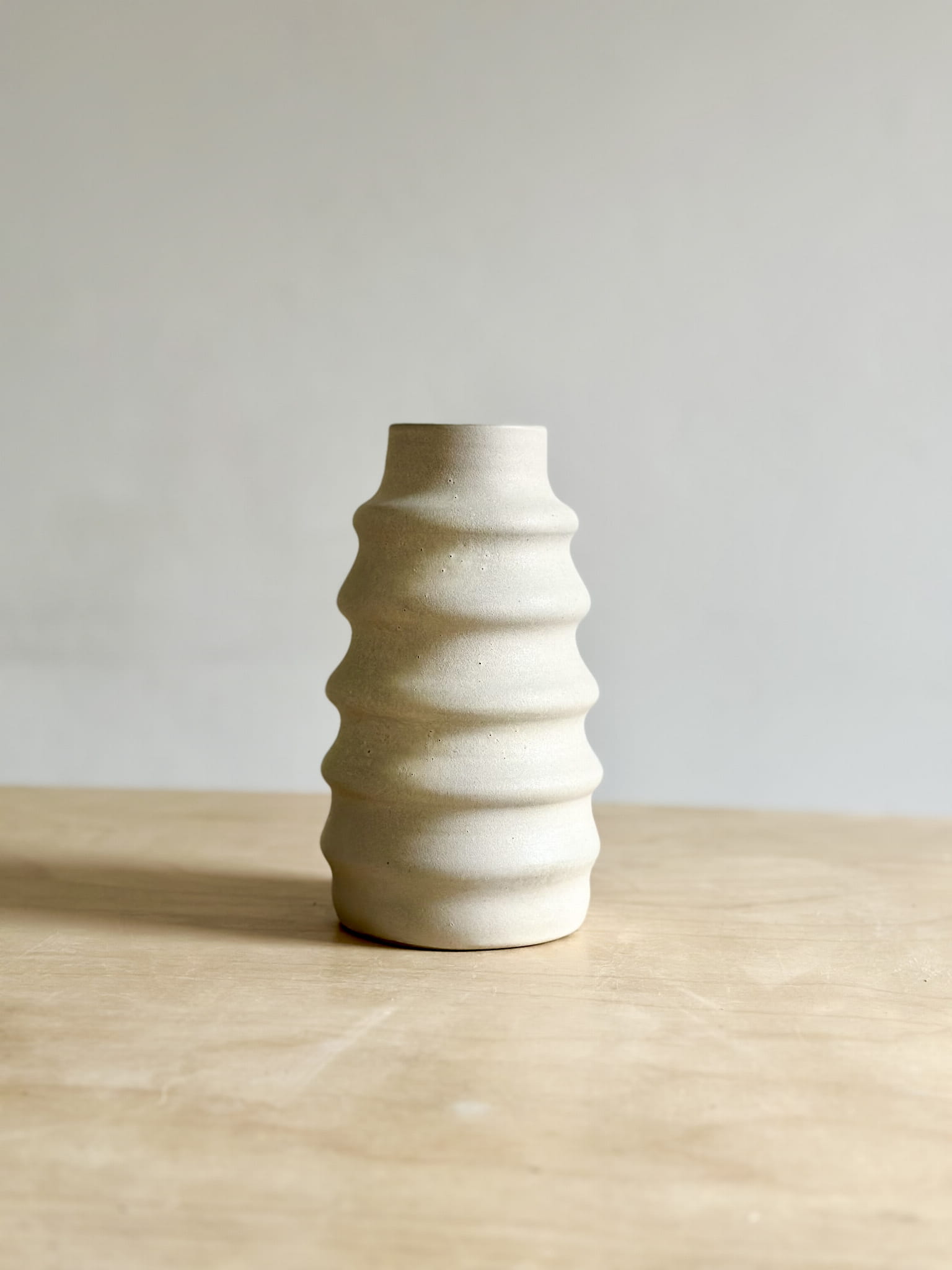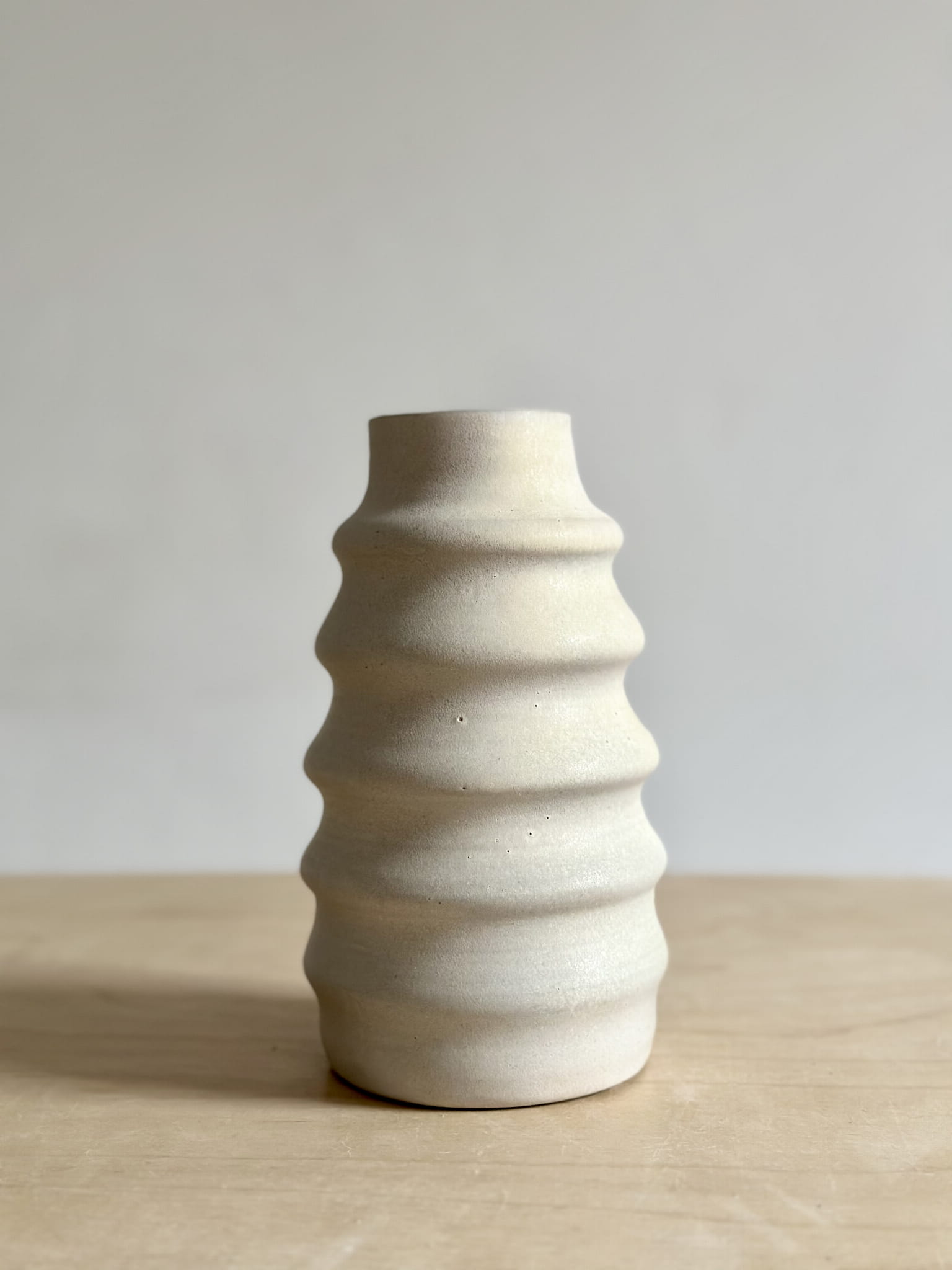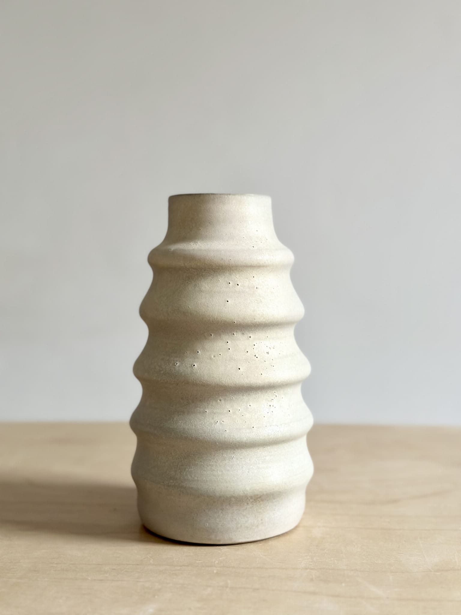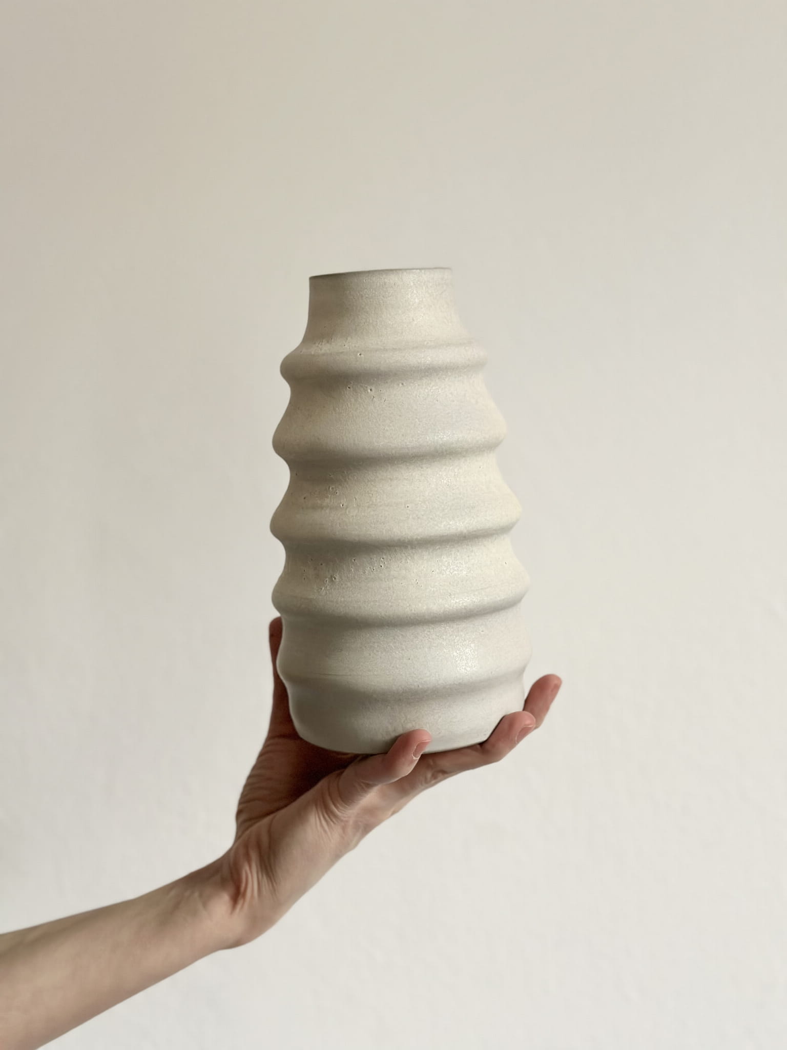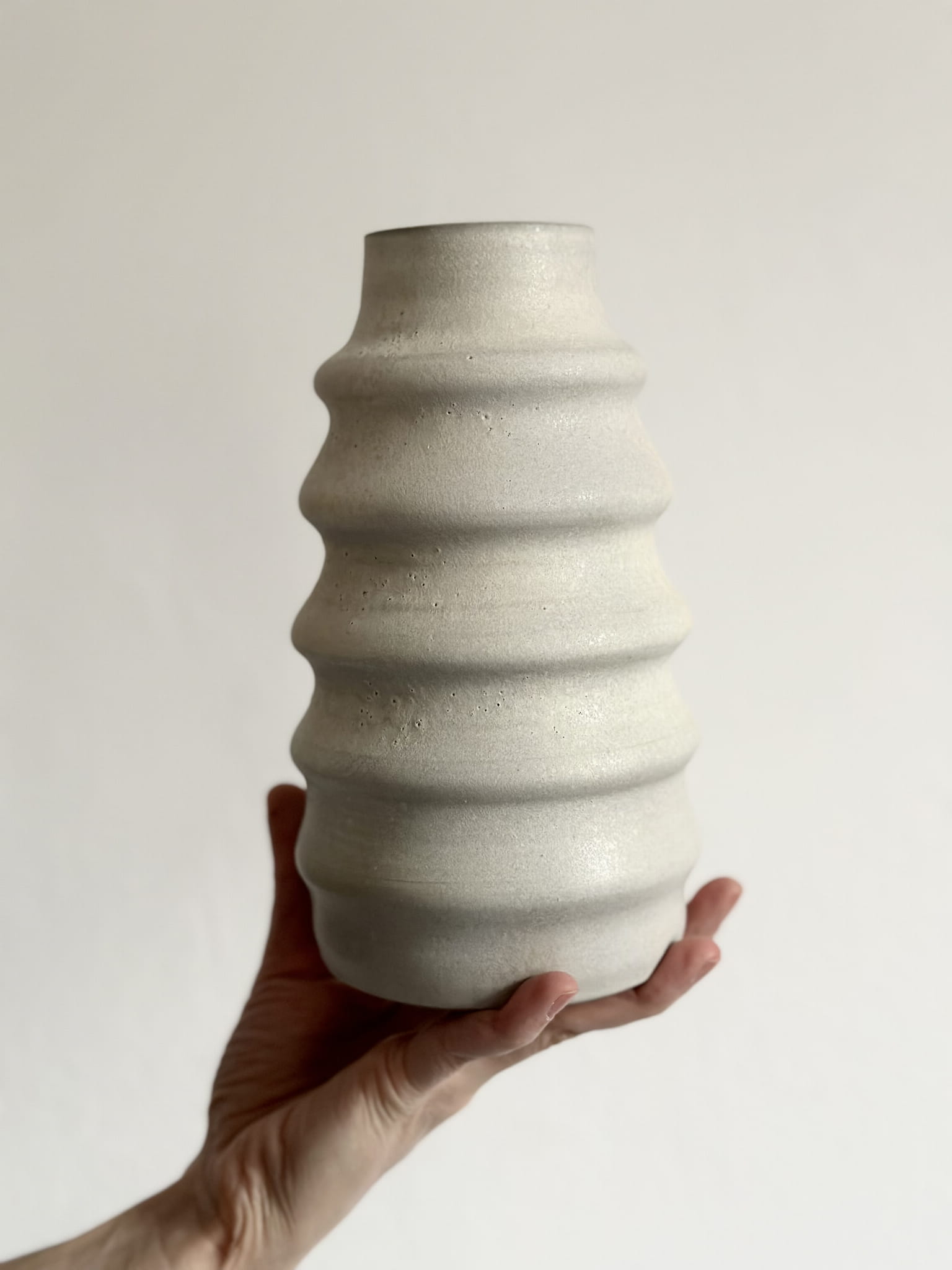 Wytoczony na kole garncarskim z szarej, gładkiej gliny kamionkowej. Wewnątrz białe błyszczące szkliwo. Na zewnątrz matowe o nieoczywistej kolorystyce - trochę bieli, delikatne róże, fiolety, błękity - jakby matowy opal. Efekt niepowtarzalny.